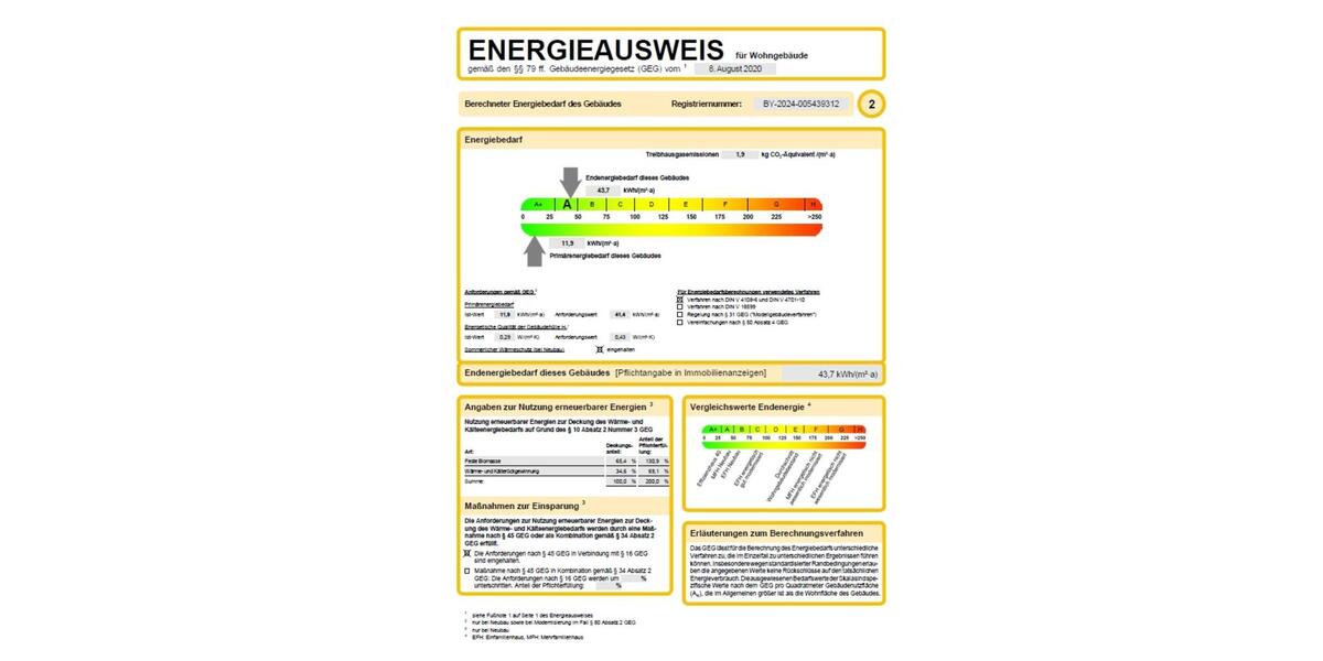 Der Energieausweis liegt vor. Der Energiebedarf beträgt 43,7 kWh/(qm\*a), Energieeffizienzklasse A.